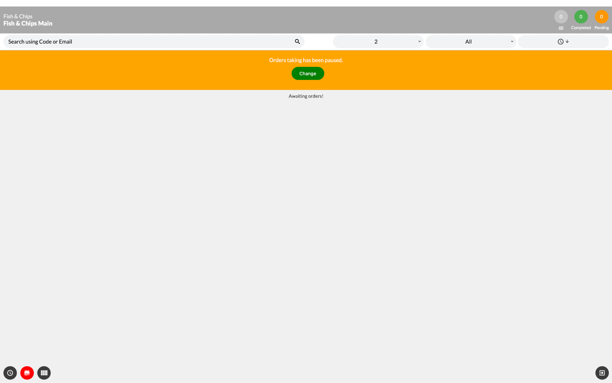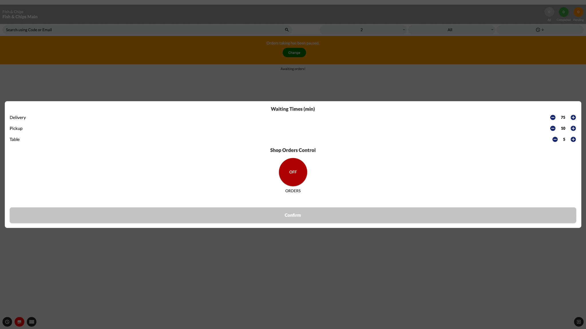 - To unpause orders, press the clock icon or the green ‘change’ button and change the ORDERS button back to ‘ON’ before pressing Confirm. When orders are unpaused, you will see ‘Awaiting Orders!’ at the top of the order screen.