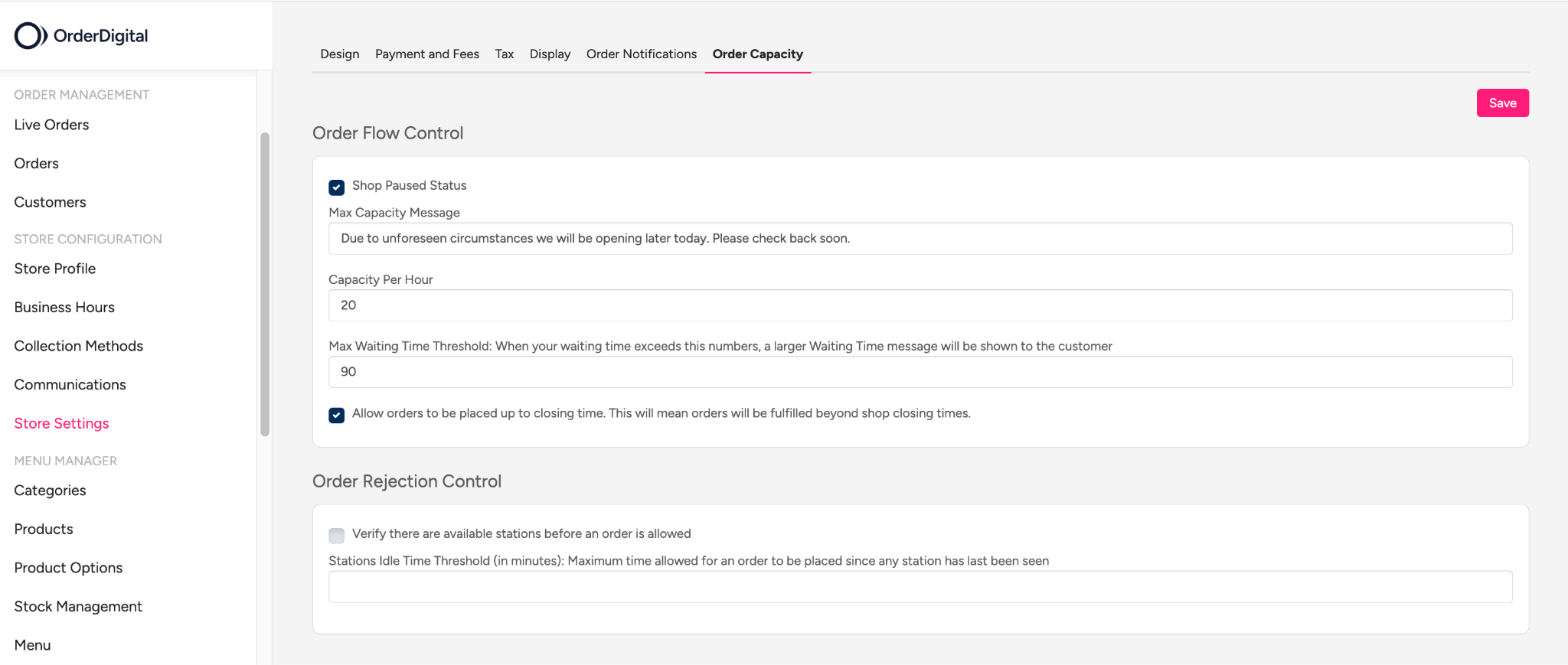 Note that we recommend that you manage waiting times or use order slot functionality rather than pause orders when the kitchen is overwhelmed with existing orders.