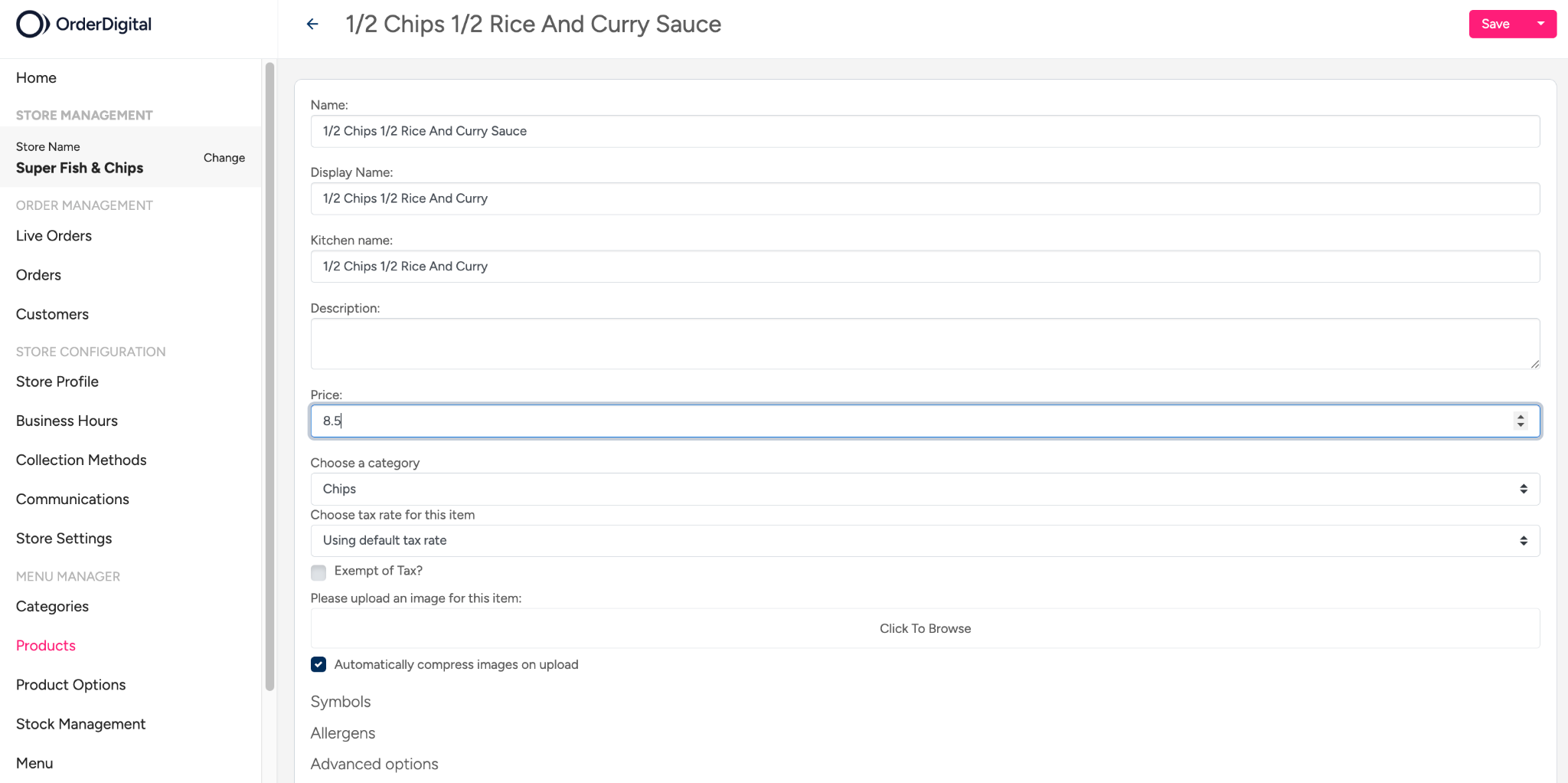 A product price is the base price (e.g., "Fish & Chips £9.50"). Product options are extras or variations (e.g., "Add mushy peas +£1.50" or "Large size +£2.00"). You change both the same way through View Products.